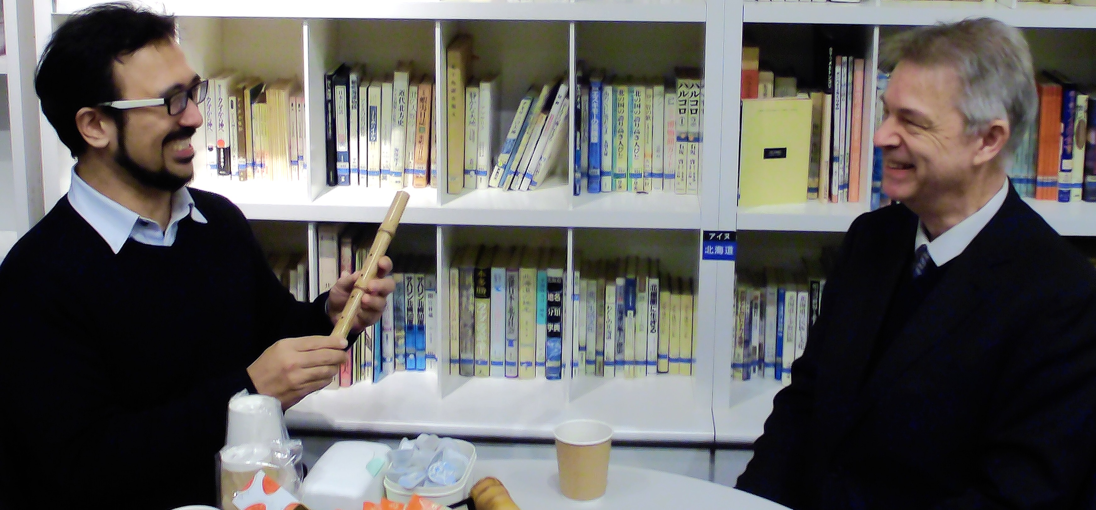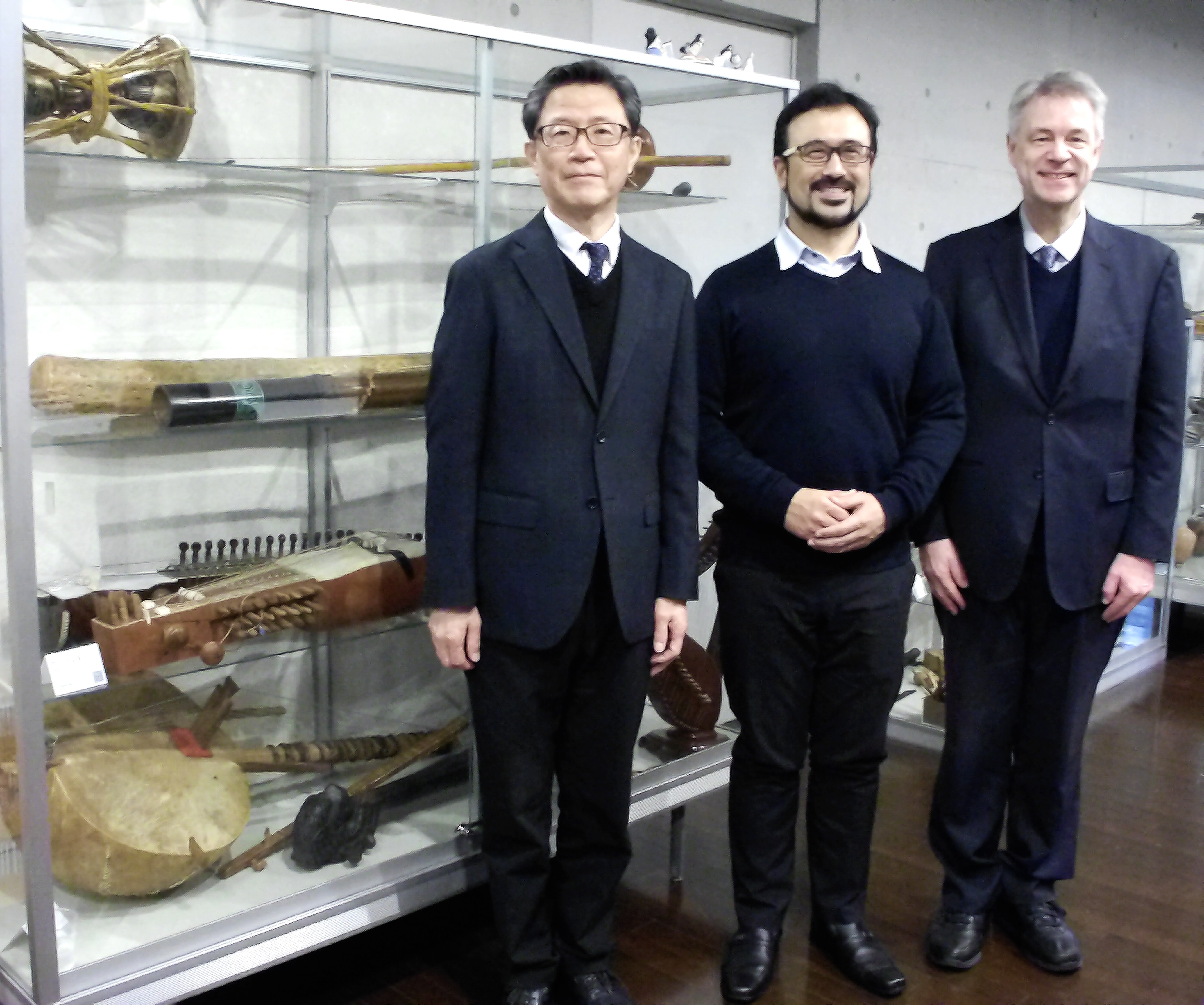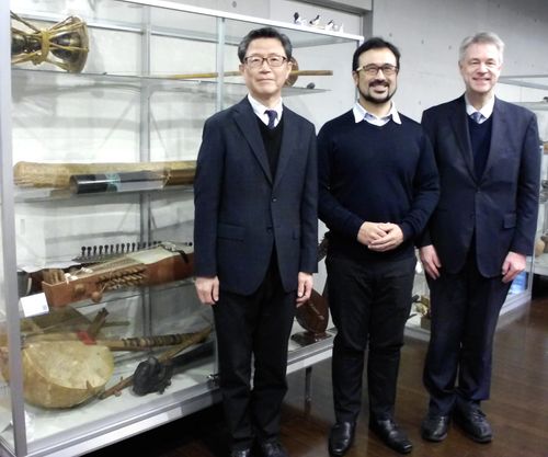 On Friday January 30, 2026, MOMRI Director Olivier Urbain and Min-On Museum Headquarters Director Kiyoshi Hayami met with Rafael Hiroshi Fuchigami, specially appointed researcher at the Institute of Ethnomusicology, Tokyo College of Music in Ikebukuro. They discussed the establishment and history of the Institute of Ethnomusicology, and visited the exhibition of rare and traditional instruments, part of the vast collection of the institute.